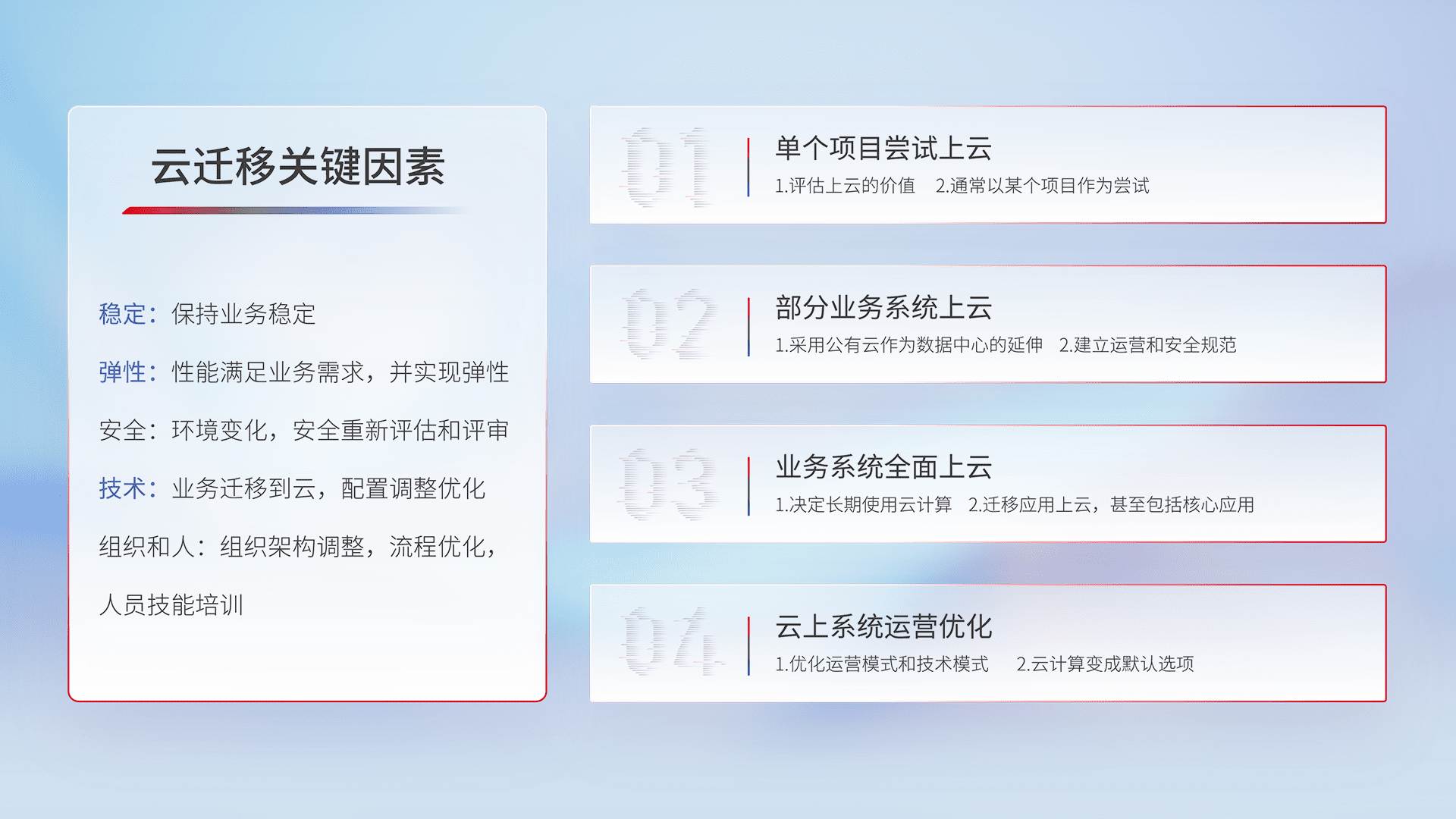 结合实际业务,,从规划设计、、、云平台选型、、、云原生改造、、、、数据迁移、、、集成交付,,,,迁移全过程为客户识别最佳上云路径,,做好风险识别管理,,,,设计网络架构、、、、身份权限、、安全审计合规、、、操作审计、、、日志审计、、、、监控告警策略、、、、多站点容灾设计等,,对云上基础设施进行整体规划,,,提升IT治理水平,,,以满足弹性、、、、高可用、、、高性能的需求。。。