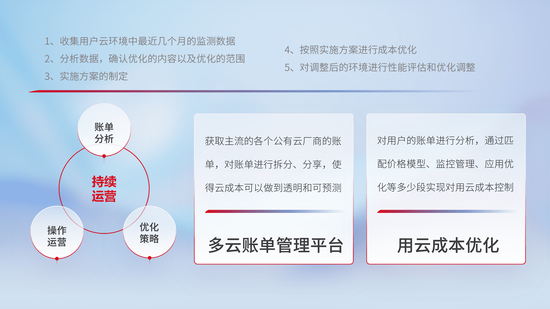 通过多云纳管,,,,以统一的资源数据模型把客户的云资源进行抽象和封装,,,进而实现对多云资源的统一操作,,保障云资源管理的可靠性、、、稳定性与可用性。。。量身定制化运维内容,,配置、、、开发运维、、、、补丁管理、、备份、、、、监控、、、认证和访问管理、、、、审计和日常巡检等,,,保障在用云过程中的可靠度,,稳定度以及高可用率。。。。
